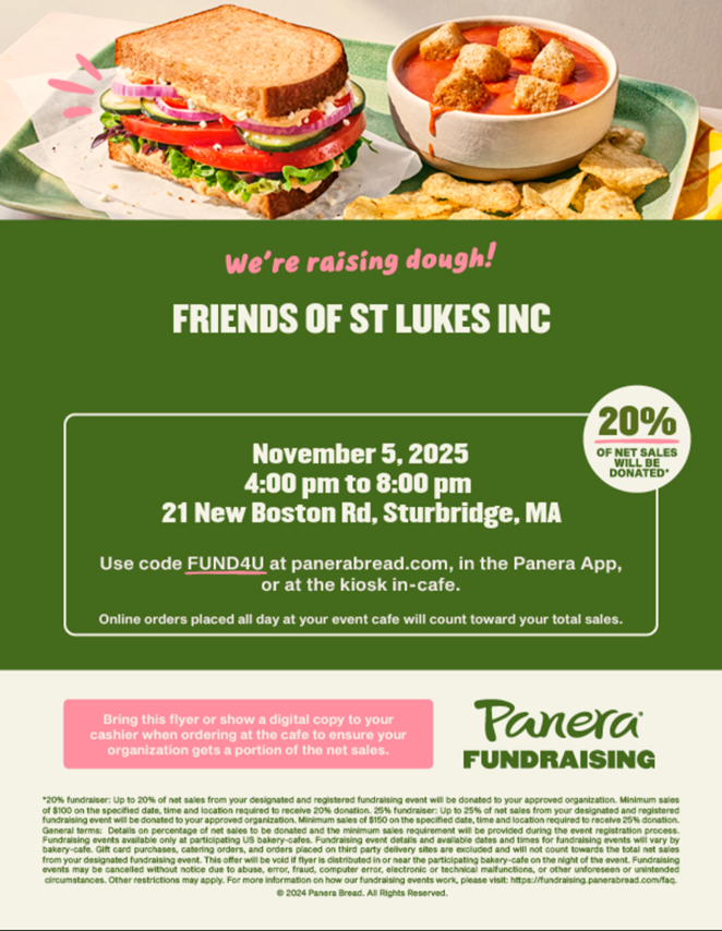 Panera Bread in Sturbridge is helping us “Raise Dough” on November 5th 4:00pm to 8:00 pm. Print or show the flier during order and Panera will donate 20% of net sales to St. Luke’s Guesthouse.