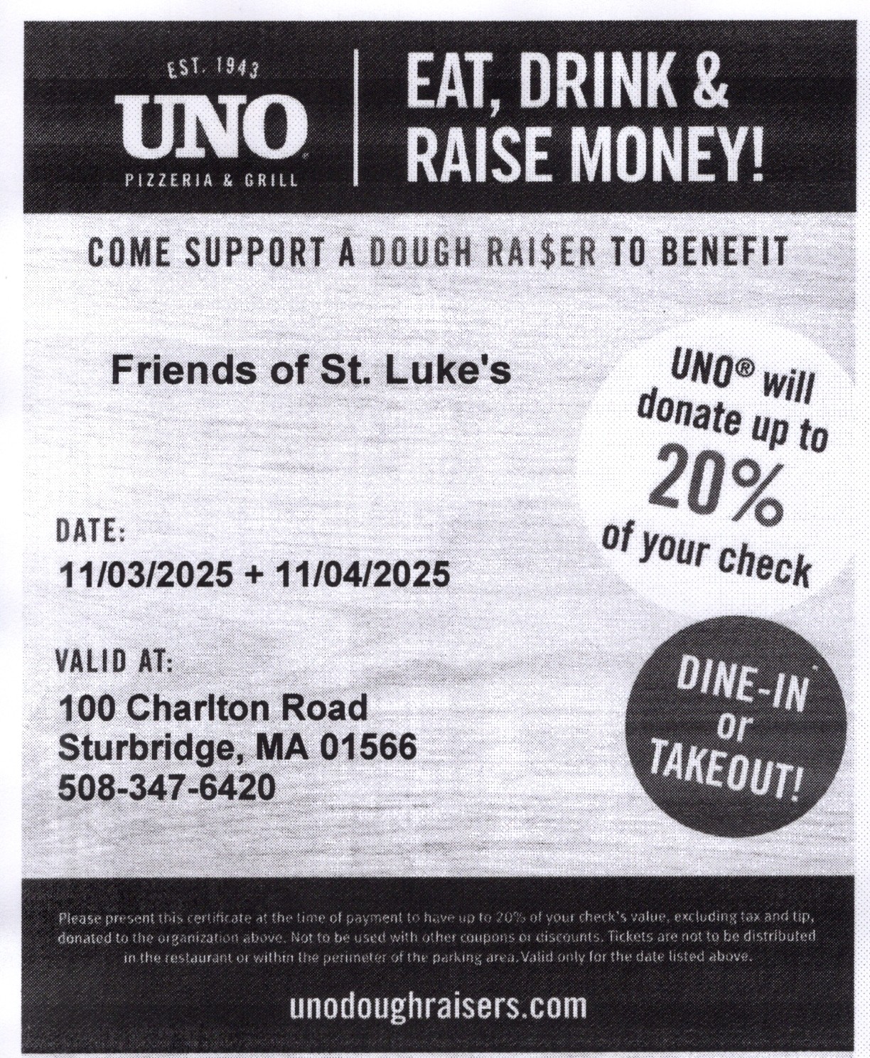 Come support a “Dough Raiser” November 3rd and/or 4th at UNO in Sturbridge. Print or show this flier to your server and UNO will donate 20% of your check to St. Luke’s Guesthouse. UNO Fundraiser 2025 Flier